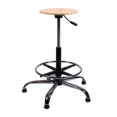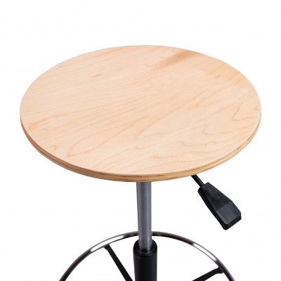 Asiento ergonómico de madera natural de 30 cm de diámetro. Pistón tipo cajero con sistema de altura regulable, accionado por palanca.