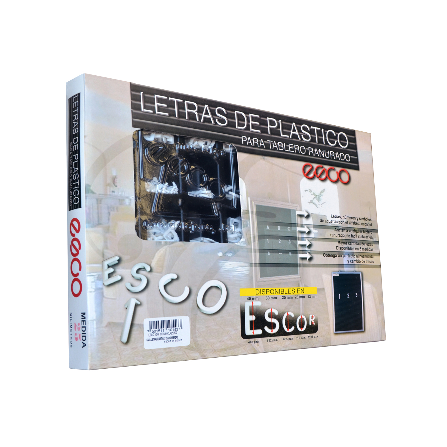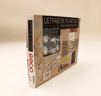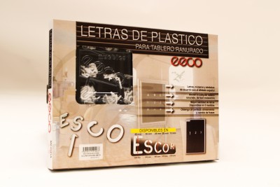 Caja contenedora de letras con cinco medidas. Inserto cónico superior para mayor sujeción evita que se cuelgue. Simbolos adecuados al idioma español.
