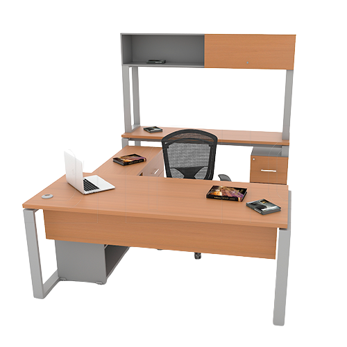 Faldón opcional; credenza baja en malamina, incluye un cajón lapicero interno y librero sobre credenza con cajonera fija en melamina. Para mayor firmeza el escritorio va atornillado a la credenza con un soporte especializado. Las cubiertas están hechas de aglomerado de madera y resina de 28 mm de grosor y laminada en plástico de alta presión para mayor durabilidad. Estructura metálica calibre 18, acabada en pintura horneada de alta resistencia.