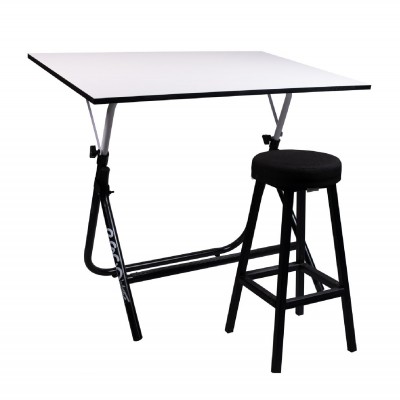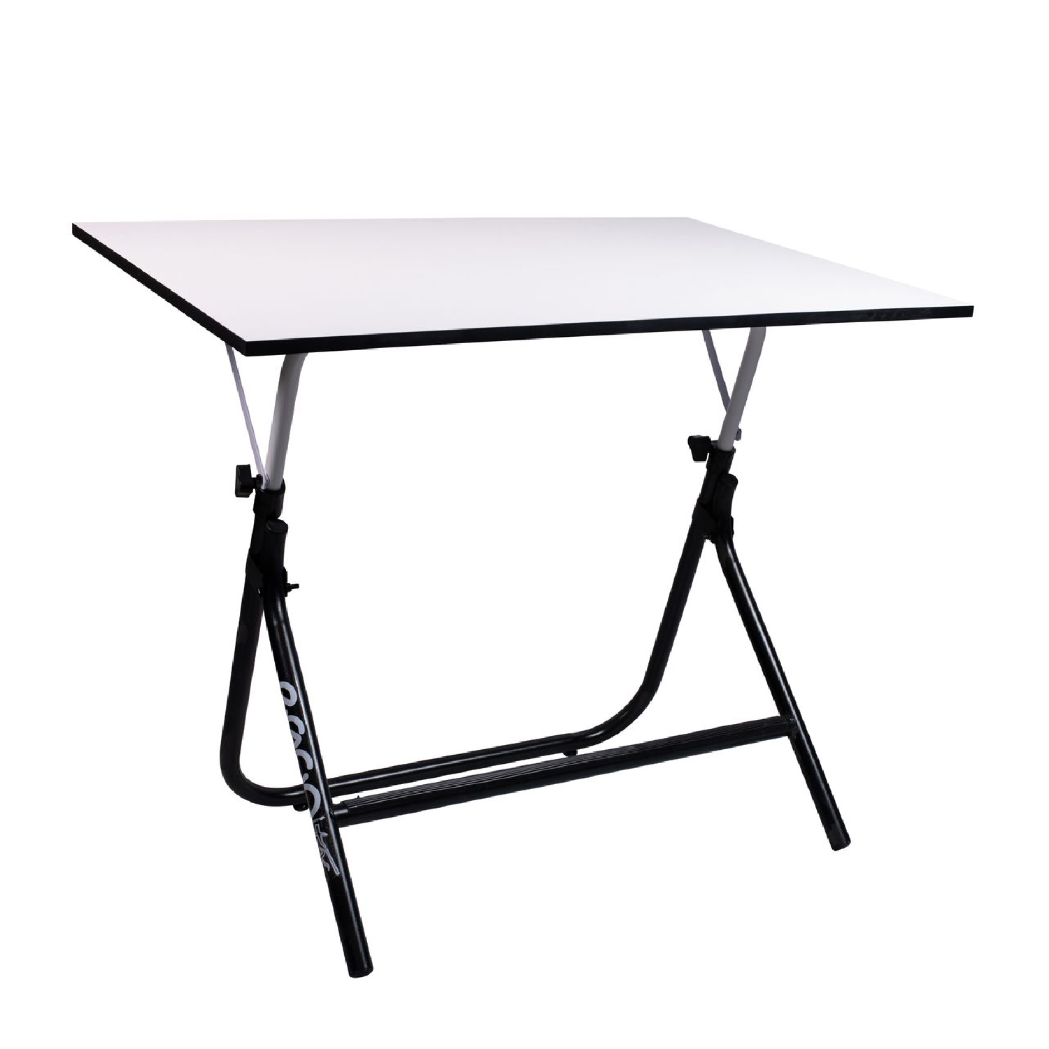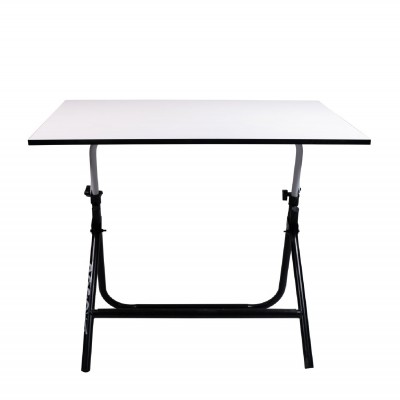 Abrazaderas con perilla de plástico ajustables, acopladas con patas telescópicas en forma de "U" de tubo redondo de 28 mm, para ajustar la altura deseada del tablero. La inclinación del tablero es de 0° a 90° gracias a su sistema exclusivo de correderas.