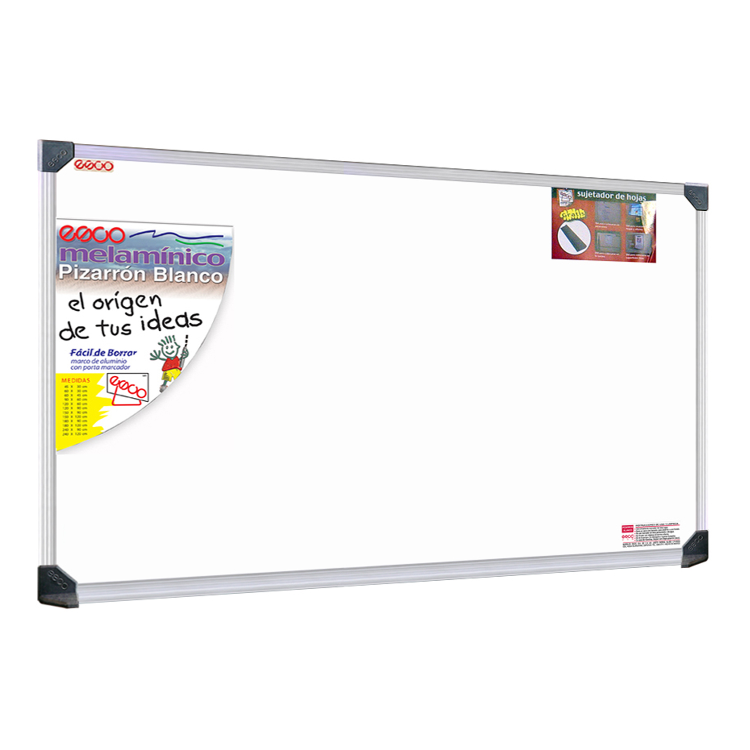 Esquinas plásticas que protegen el pizarrón, integra en la parte posterior bocallave para fijarse a la pared.